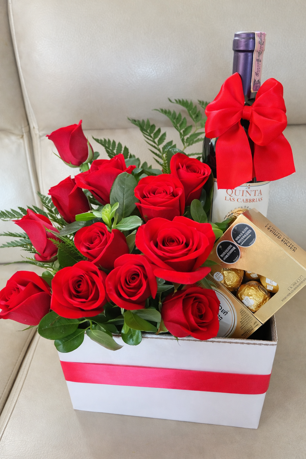 Caja x 12 rosas, botella de vino y ferrero x 8 unidades R189